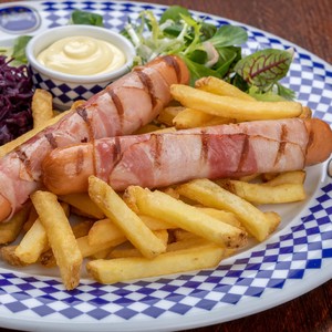 2 Wurstel a base di carne di maiale ripieni di formaggio e avvolti nella pancetta, serviti con crauti rossi, insalatina, patate fritte e maionese.
