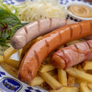 Un Bavarianwurst a base di carne di maiale e manzo con una leggera speziatura di paprika dolce, un Wurstel a base di carne di maiale ripieni di formaggio e avvolti nella pancetta, un Bratwurst "bianco" a base di carne di maiale e manzo insaporito da un mix di erbe, serviti con insalatina fresca, patate fritte*, senape e accompagnato da un brezel*