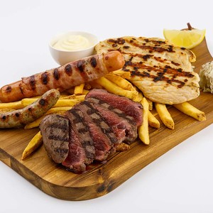 Tagliata di manzo*, petto di pollo*, Würstel Berna e Salsiccia di Norimberga IGP, accompagnati da patate fritte*, insalata di cavolo e maionese