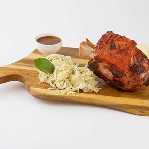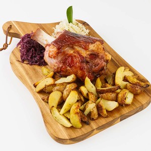 Stinco di maiale di circa 1 kg, affumicato al legno di faggio, servito con patate arrosto,