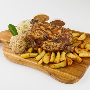 Mezzo pollo arrosto con contorno di crauti, insalata di cavolo e patate arrosto, servito con senape dolce bavarese e demi-glacè alla birra Marzen